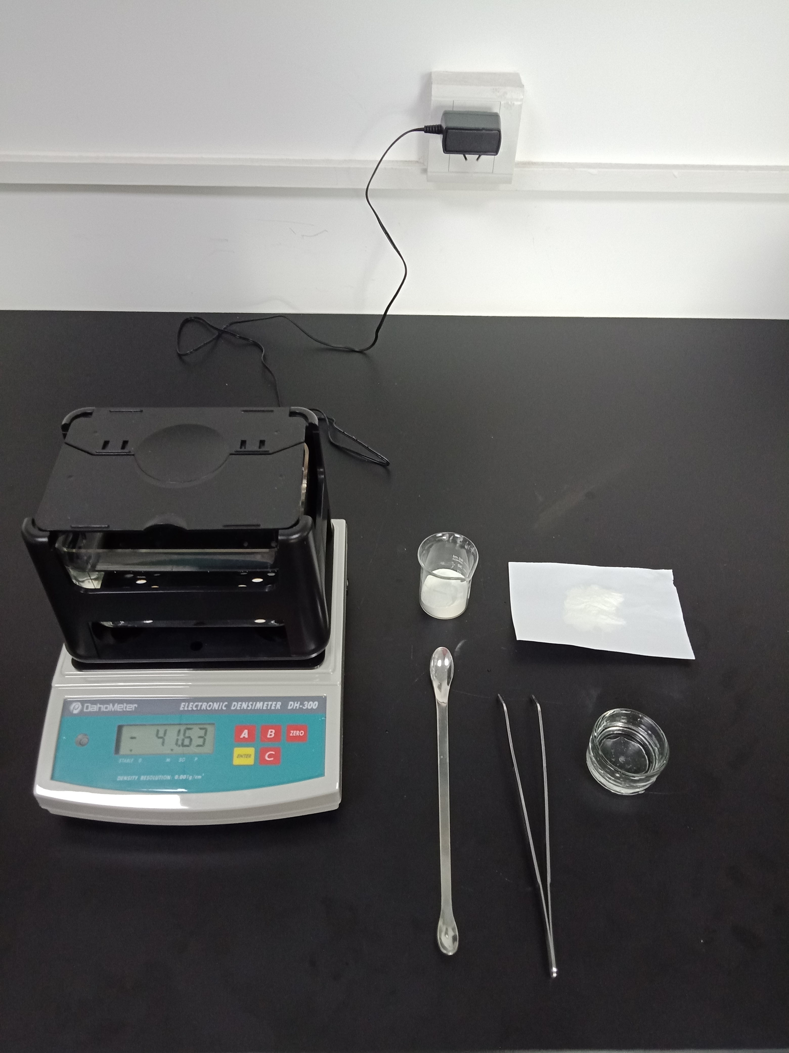 1,準備好測試儀器DH-300,測試樣品和測試工具小玻璃杯一個,鑷子一把,勺子一個,測試用紙一張(如圖1)