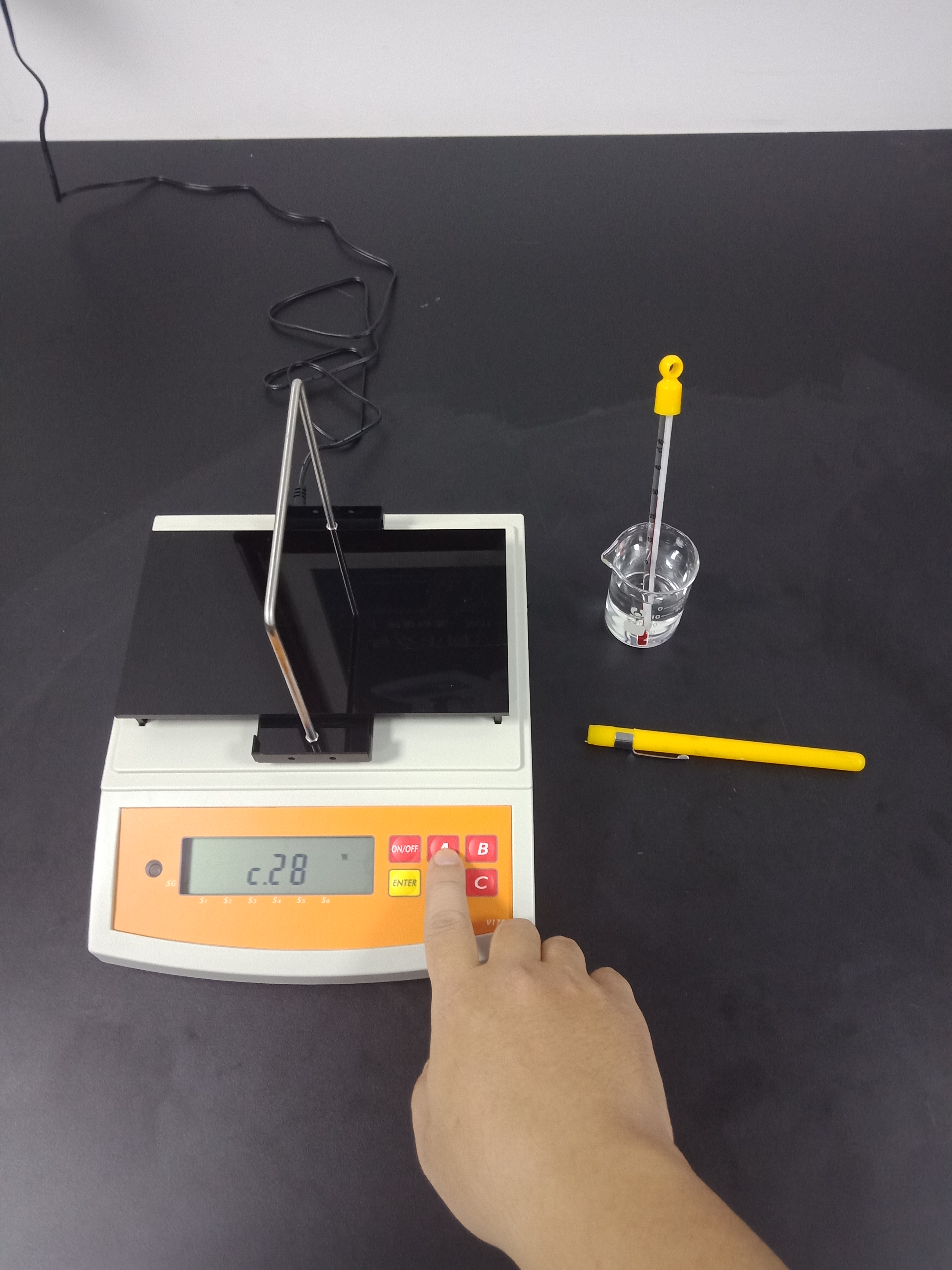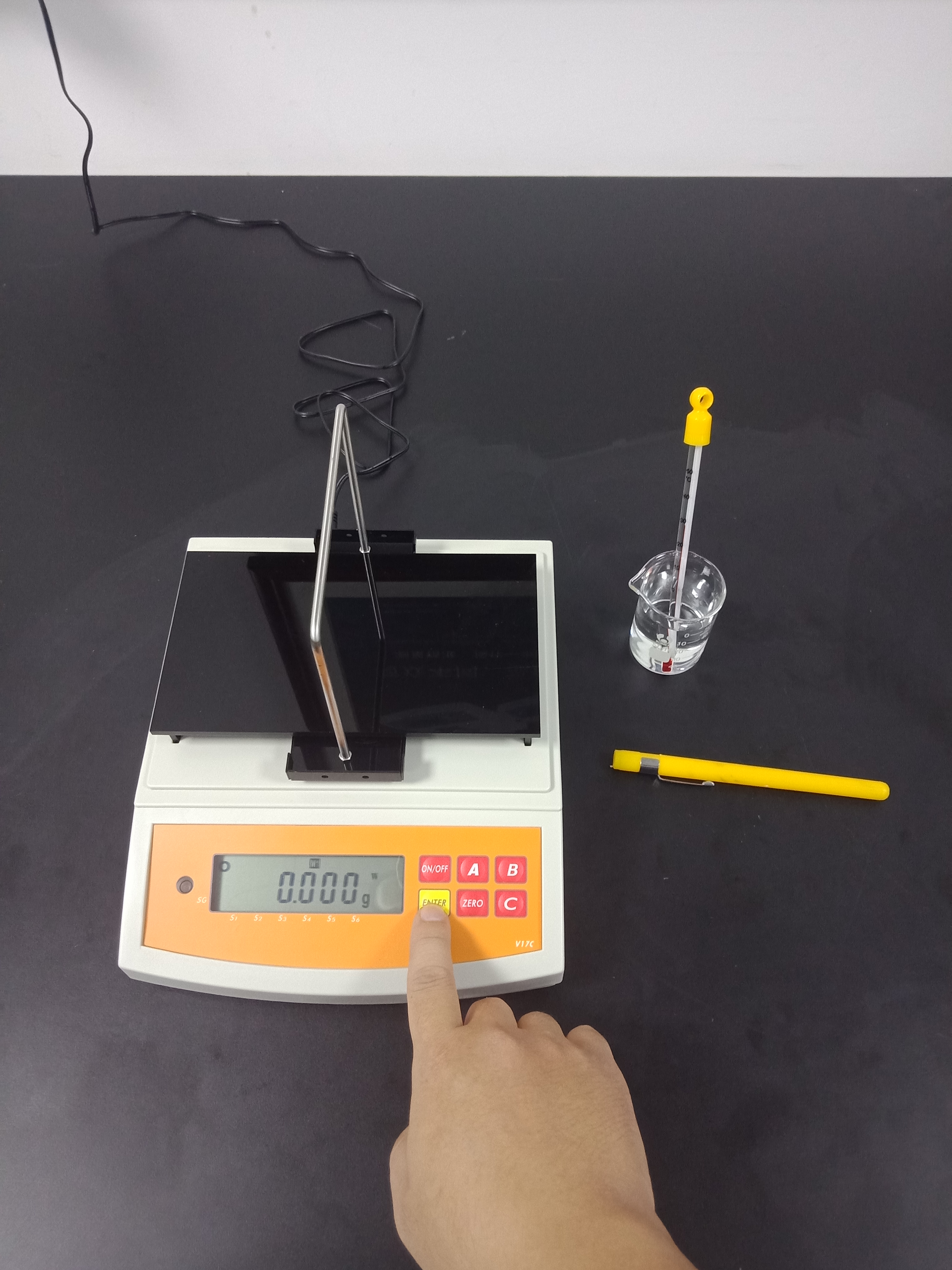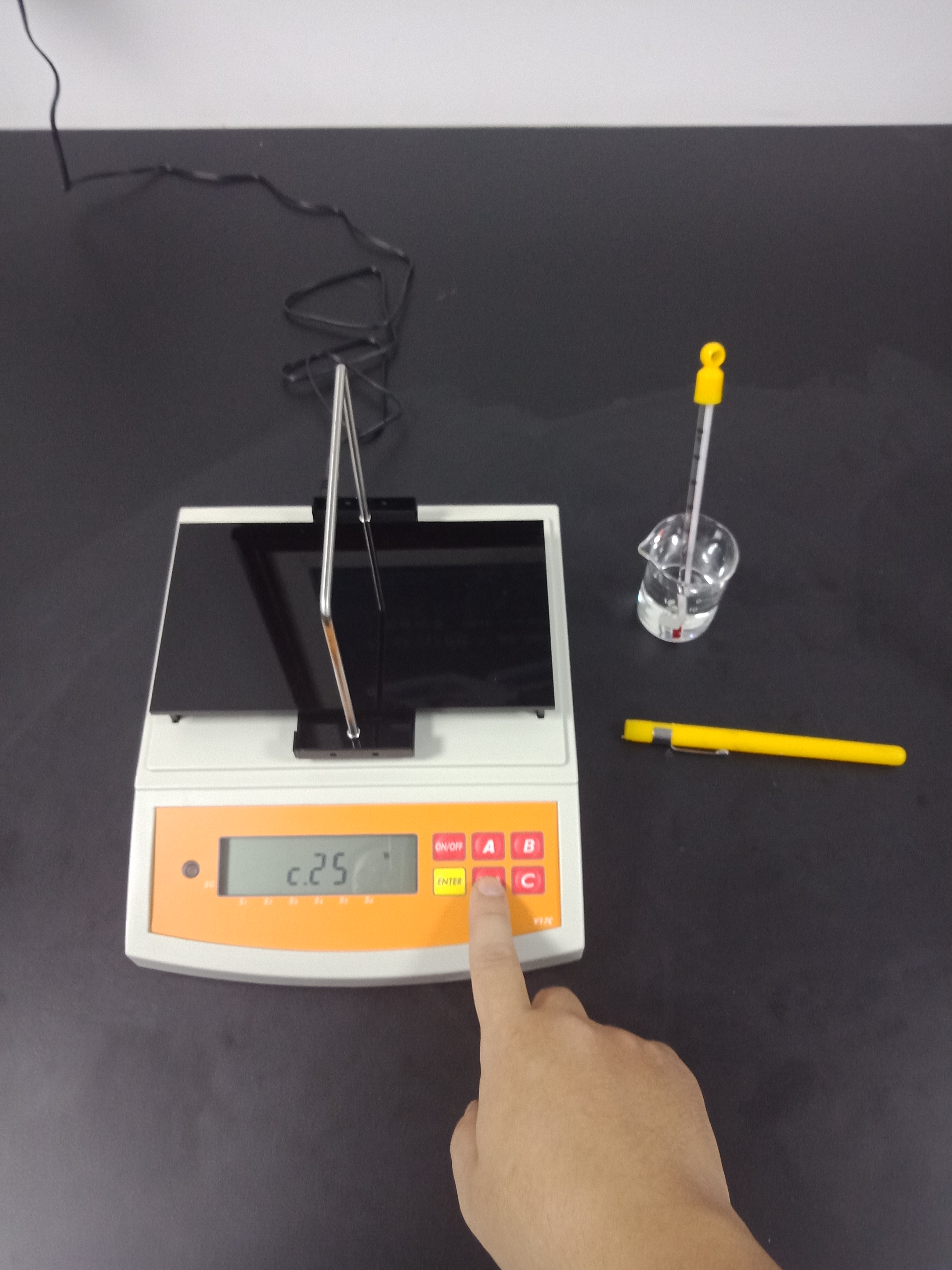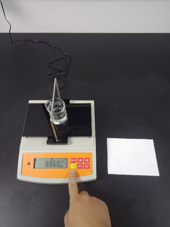 3),記錄好測試結果后,再按一次【ENTER】鍵返回待測模式,并將已測液體樣品,掛鉤和測試用砝碼取下,結束此次測試,如下圖