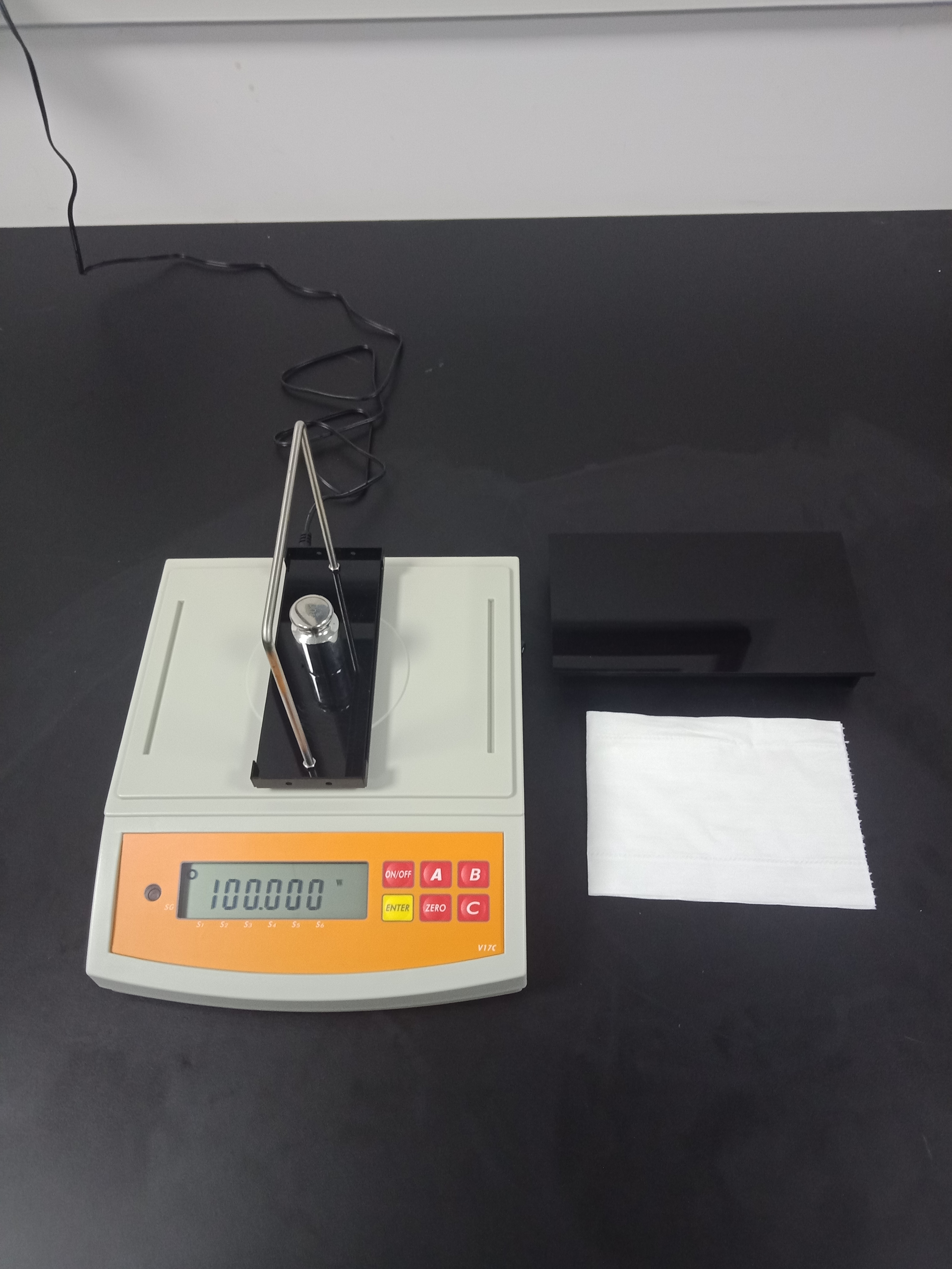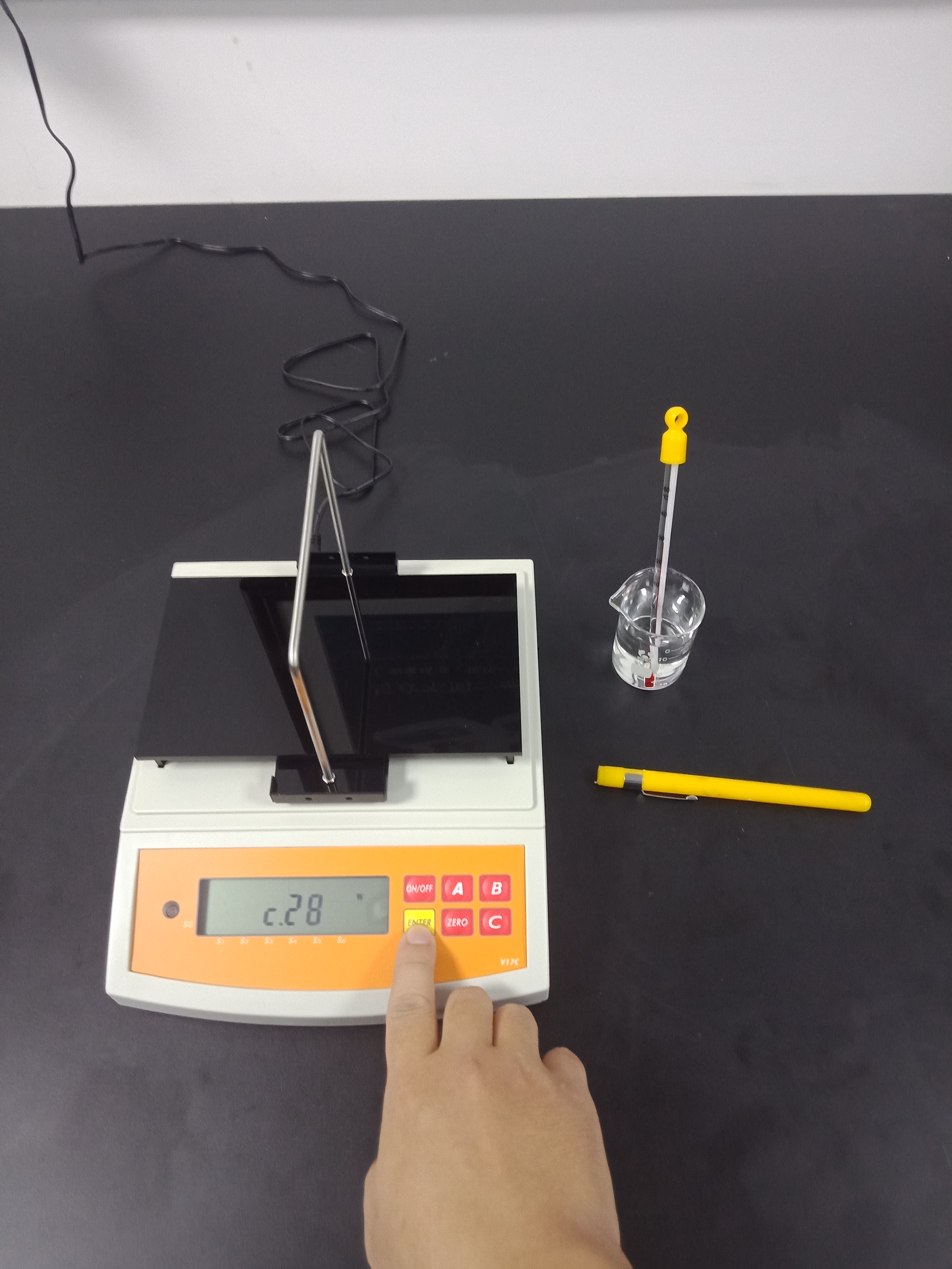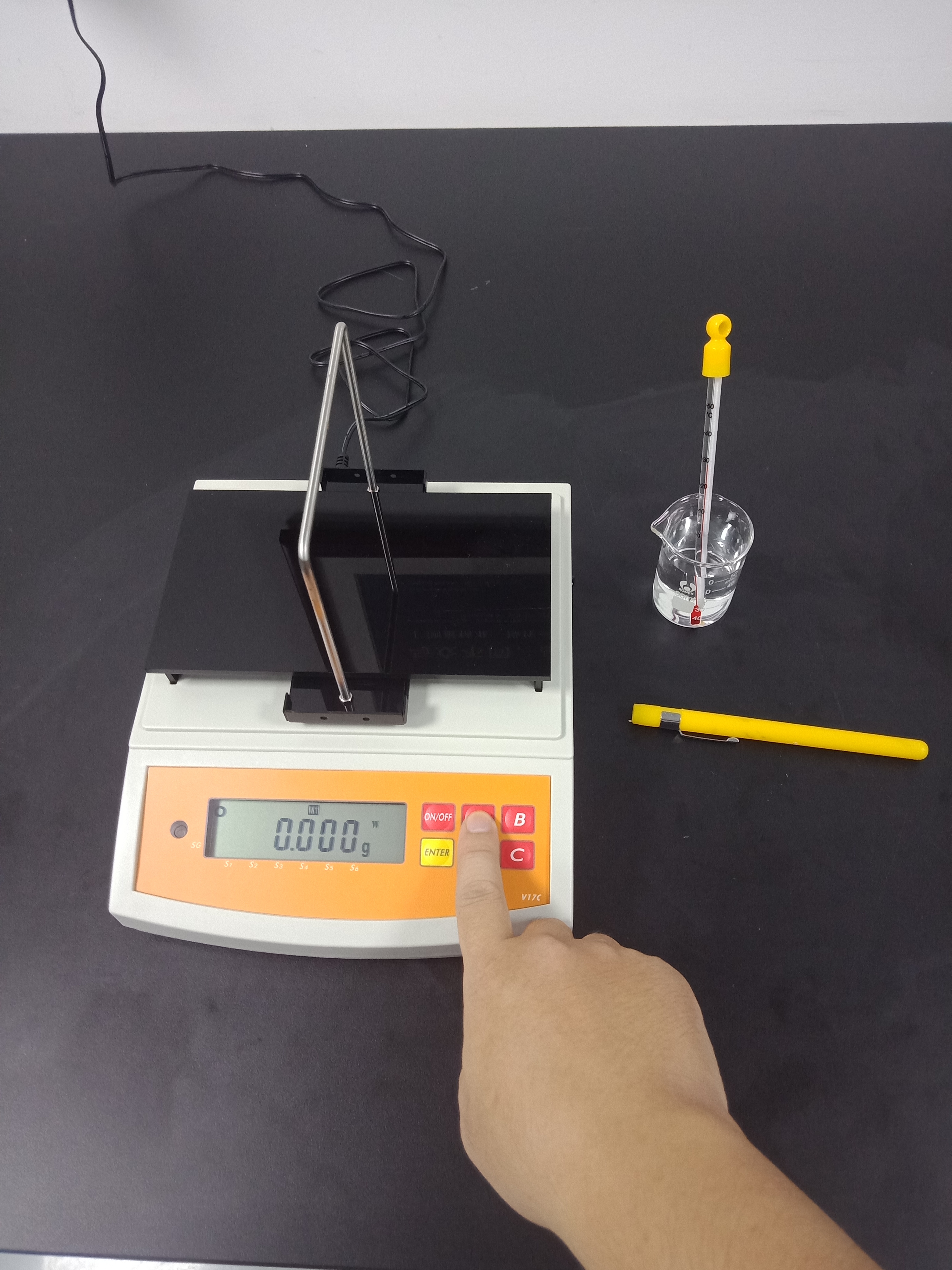 3),記錄好測試結果后,再按一次【ENTER】鍵返回待測模式,并將已測液體樣品,掛鉤和測試用砝碼取下,結束此次測試,如下圖