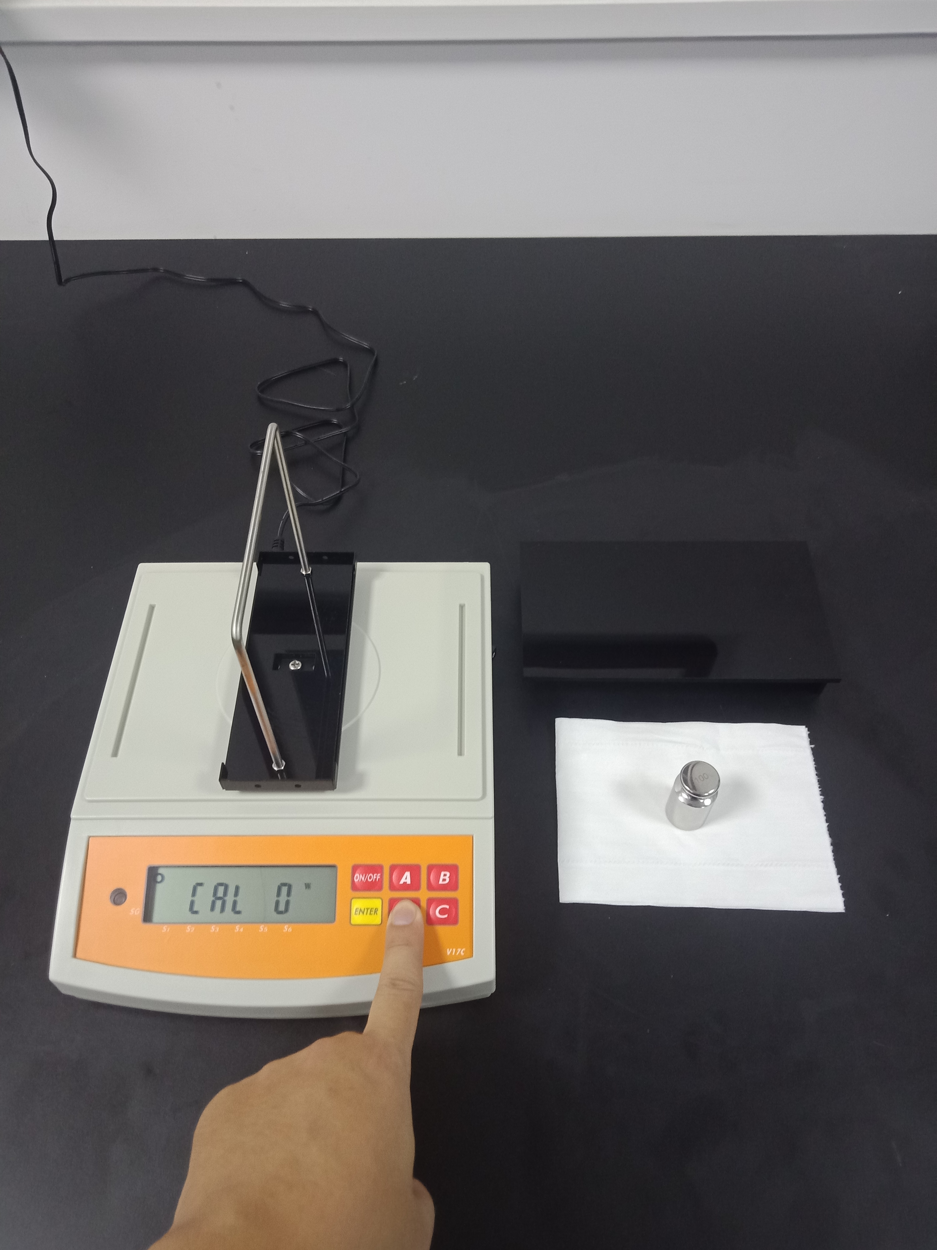 等待屏幕顯示從【CAL 0】轉換成【100.000】閃爍后,將100g標準重量砝碼放到測量架正中間處,儀器會自動進行校準,校準結束后,屏幕顯示的【100.000】停止閃爍(圖1)