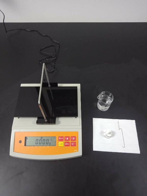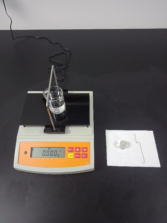 1, 用50ml的燒杯裝50ml的純凈/蒸餾水,準備好測試用的玻璃/不銹鋼砝碼(演示操作中用的是玻璃砝碼)和掛鉤一個,如下圖:
