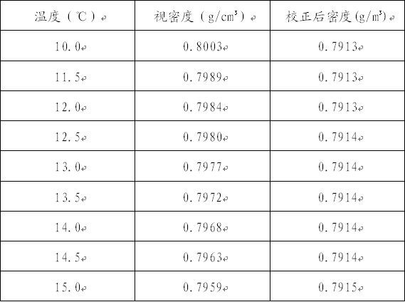正文:按GB4472-84《化工產(chǎn)品密度、相對密度測定通則》中2.3.3的規(guī)定和GB/T338-92《工業(yè)甲醇》,在常溫下進行測定。密度計的視值范圍為0.750~0.800g/cm3。在15~35℃的溫度范圍內(nèi),試樣密度的溫度校正系數(shù)K值為0.00093 g/cm3℃。