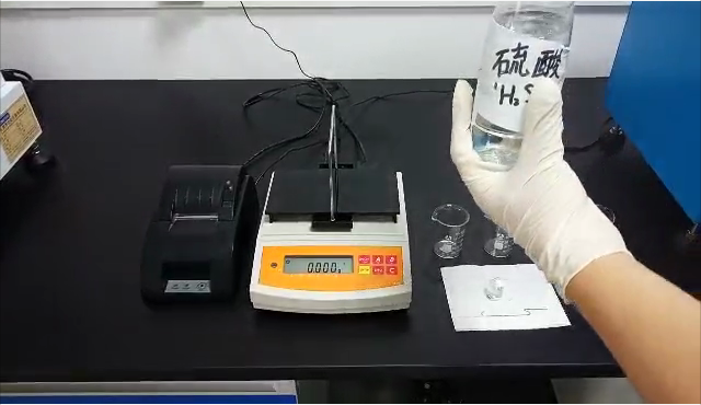 3,用掛鉤勾住測試用標(biāo)準(zhǔn)砝碼后,再將掛鉤垂吊在測試樣品的正上方,測試用標(biāo)準(zhǔn)砝碼浸沒在樣品里;
