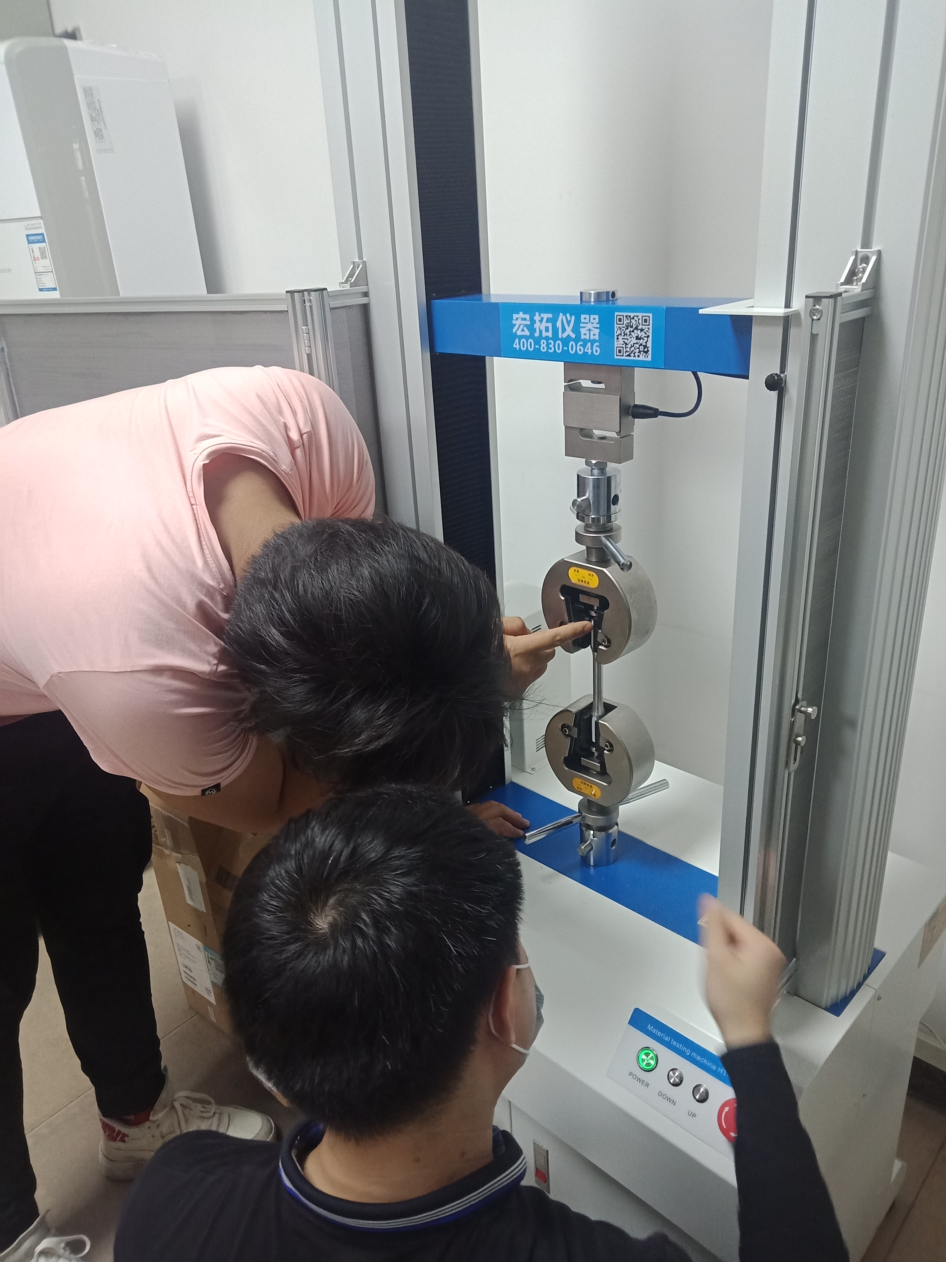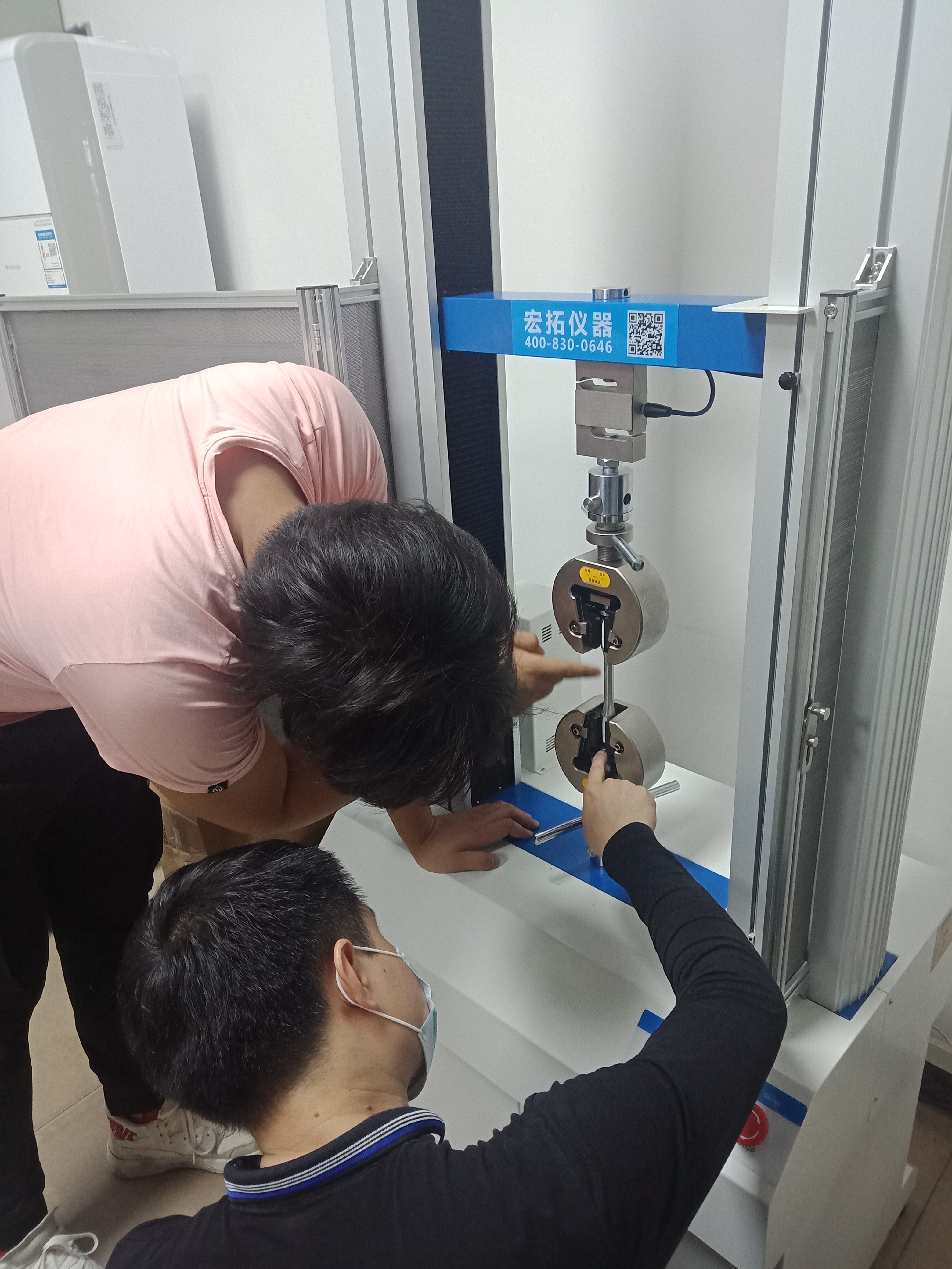 東莞宏拓儀器工作人員正在指導帥翼馳實驗室操作員如何操作使用HT-140SC-50型金屬拉力試驗機