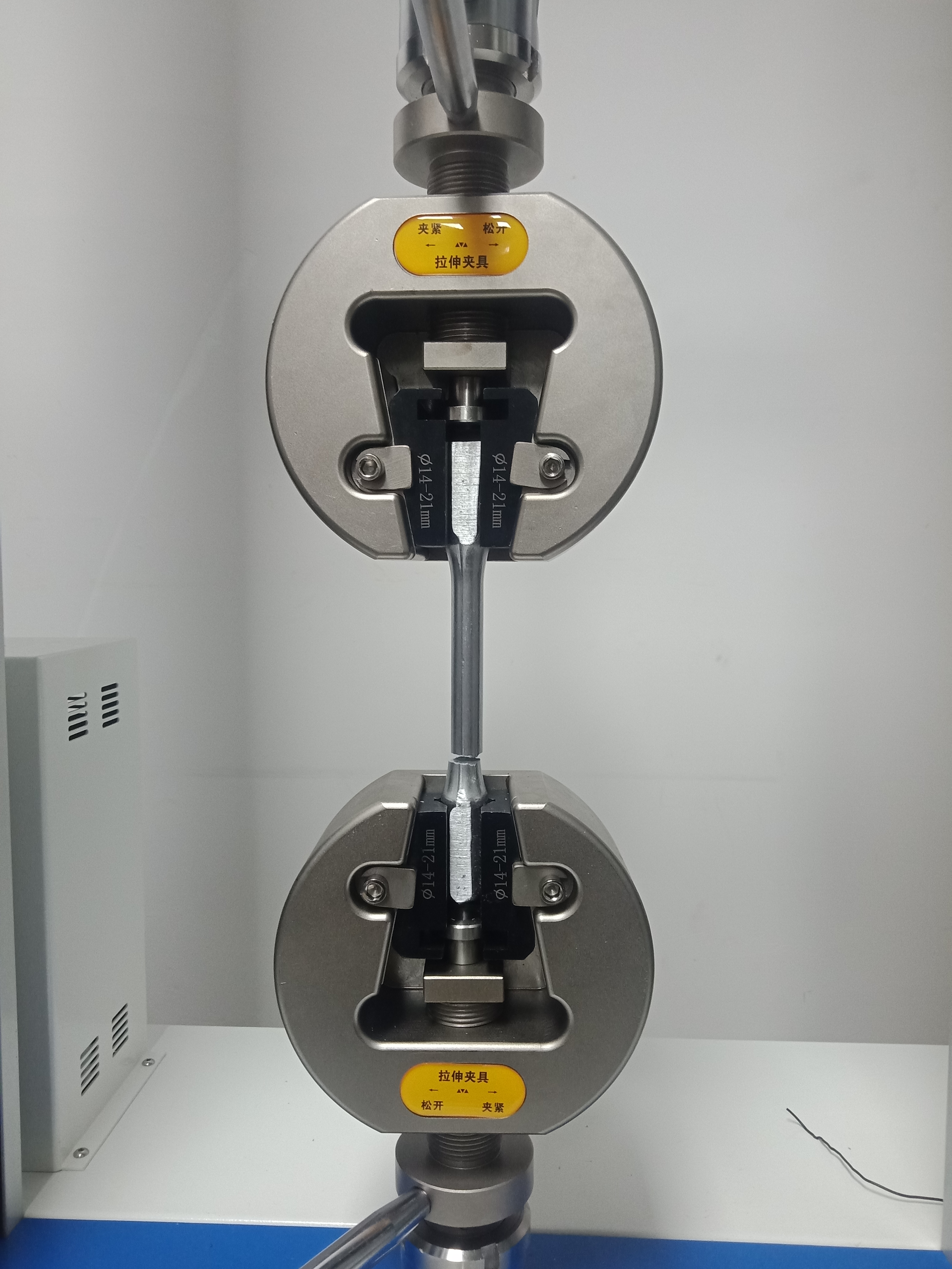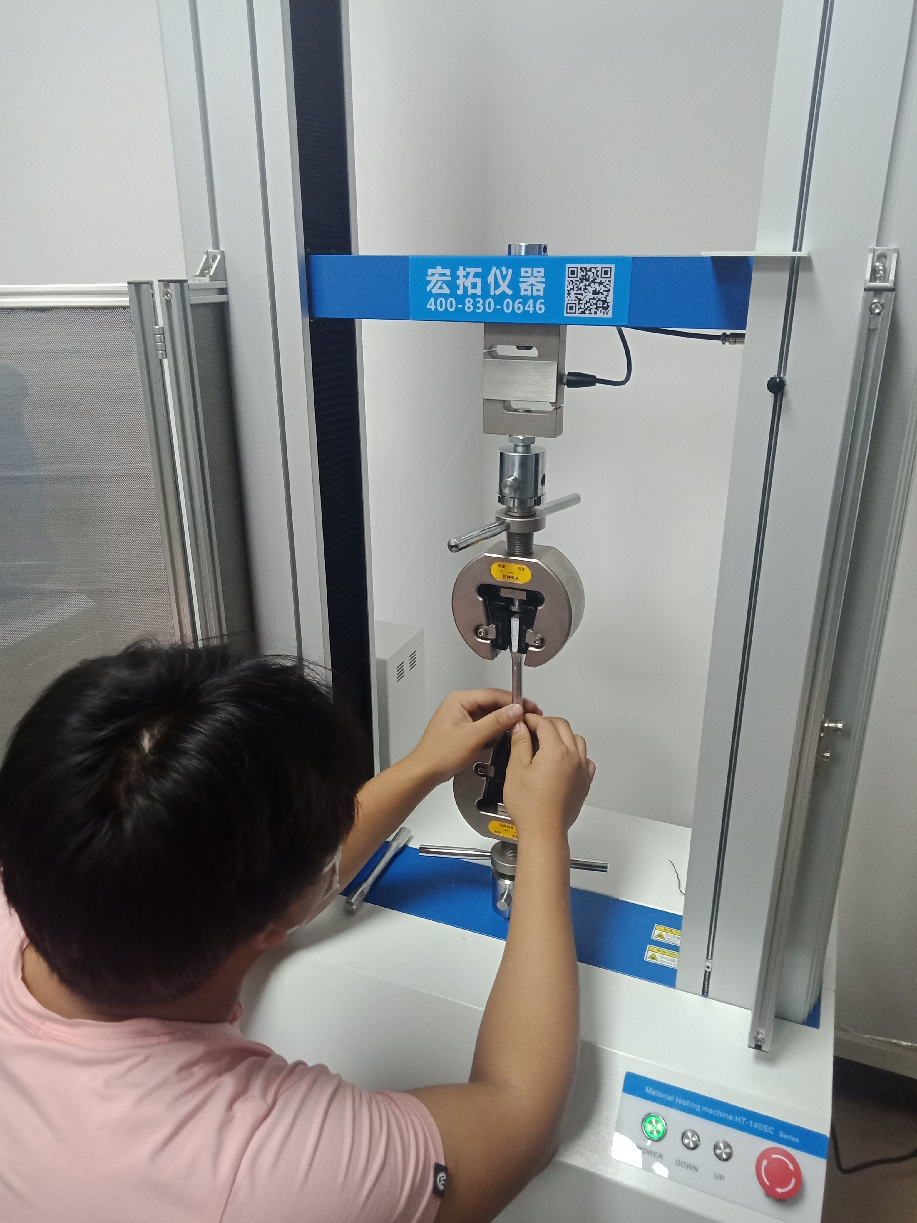 惠州帥翼馳實驗室操作員正在使用HT-140SC-50型金屬拉力試驗機進行鋁合金拉伸強度測試
