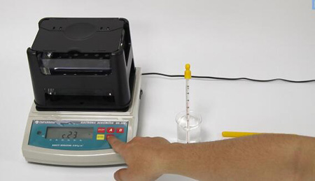 以DH-300密度測試儀為例介紹,溫度補償操作:第一步:準(zhǔn)備好一杯常溫蒸餾水和溫度計,將溫度計放入水中1~3分鐘,再觀察讀取水溫。如圖