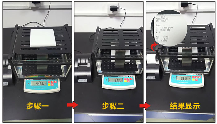 步驟一:因為測試樣品為浮體材料(密度值小于1),需要用到抗浮架,把抗浮架放入水中的吊欄中,待穩定后,按鍵重量清零。在密度計顯示0.000g狀態下,把樣品放在測量架上,待重量穩定后,按鍵后,儀器會自動儲存空氣中的重量。