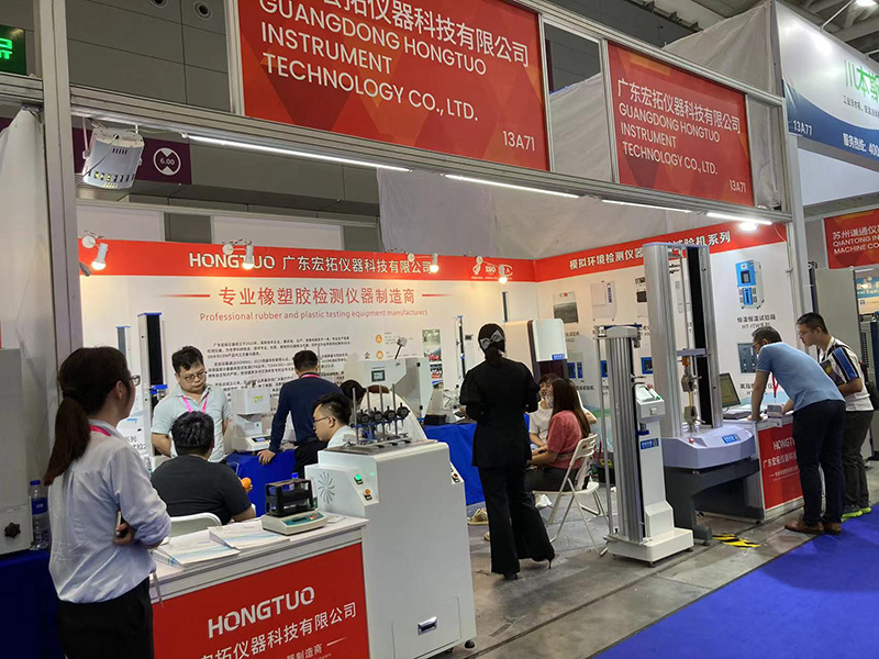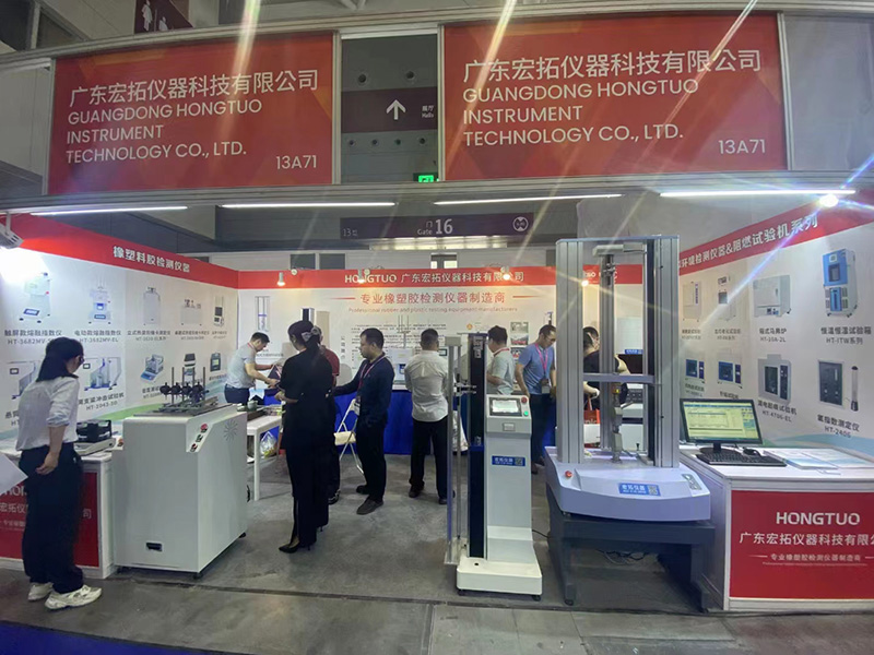 本次展會中,廣東宏拓儀器不僅將公司拳頭產品雙柱拉力試驗機,單柱拉力試驗機,熔融指數儀,固體密度測試儀帶到展會上,還將最新自主研發的沖擊試驗機,維卡軟化/熱變形溫度測試儀和流變儀等儀器在這次展會上首次亮相,瞬間吸引不少來訪客戶的興趣和咨詢。