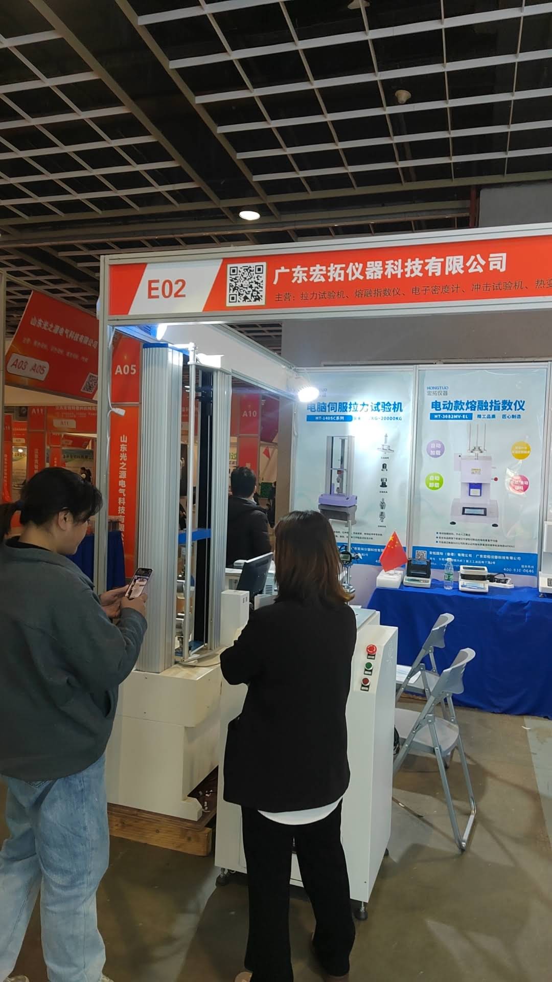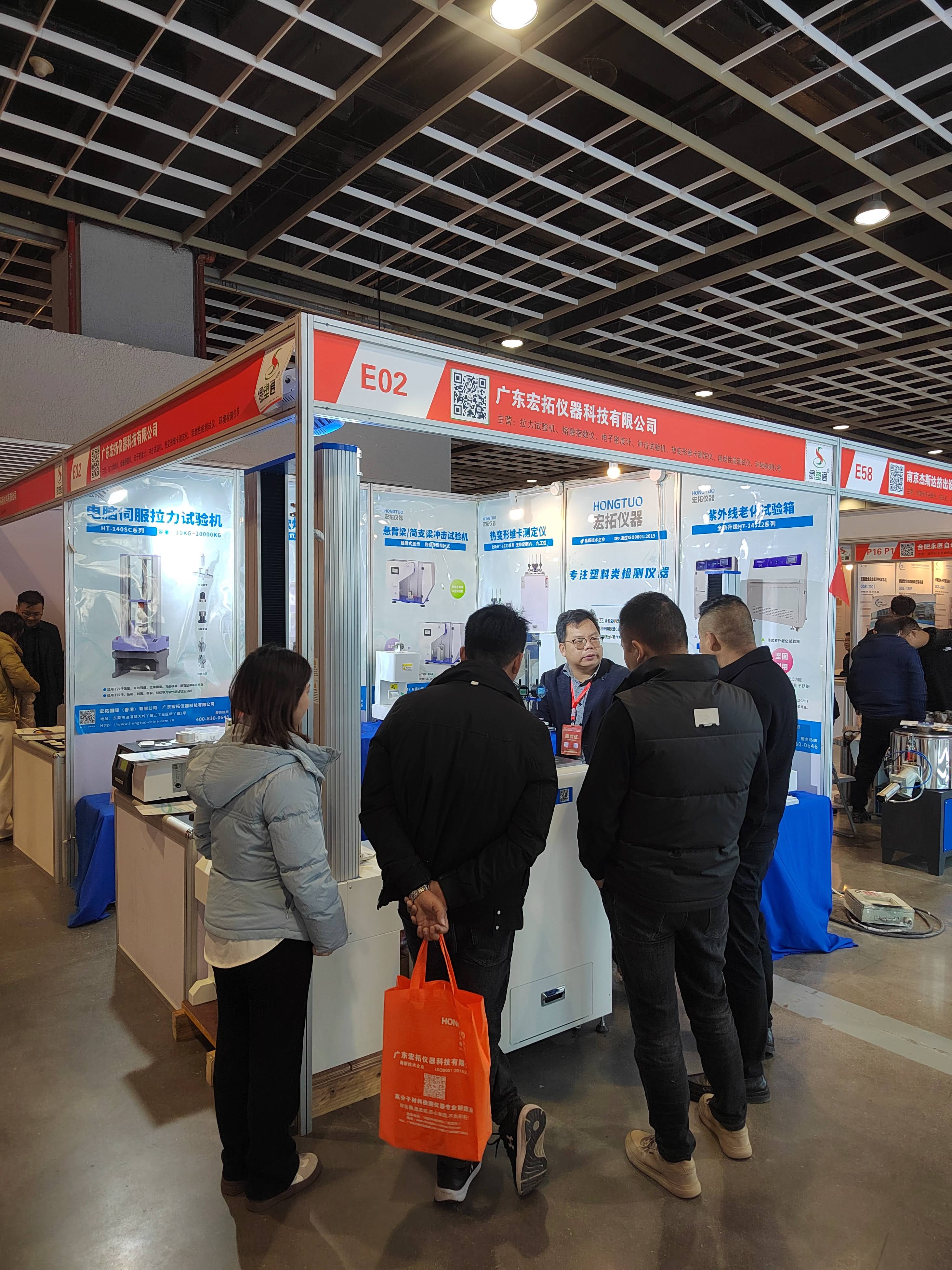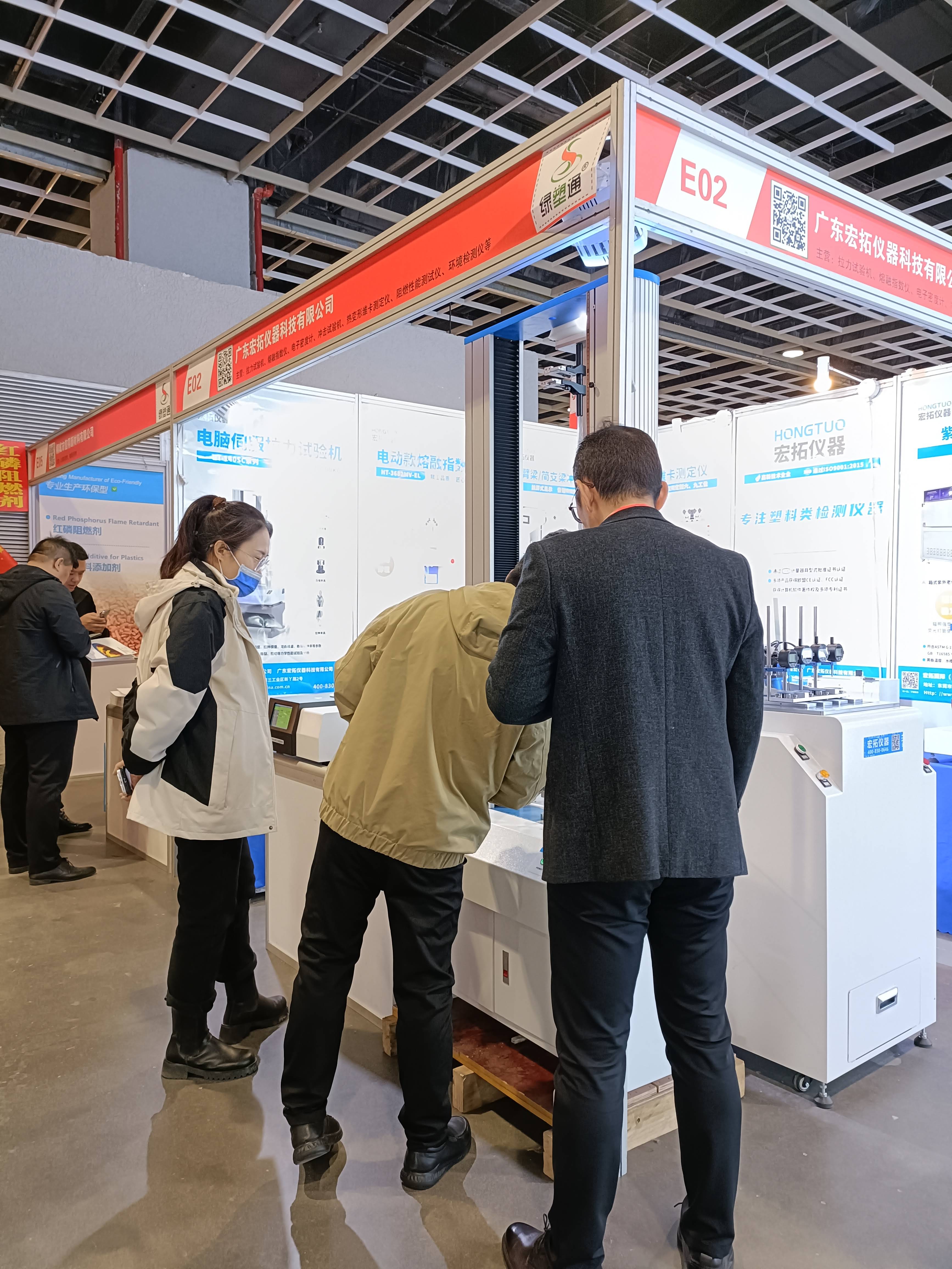 現場E02號展位,宏拓儀器攜塑料行業的明星產品,如萬能材料試驗機、熱變形維卡試驗機、差示掃描量熱儀,懸臂梁沖擊試驗機、熔體流動速率儀,密度測試儀等塑料行業物性測試儀器,宏拓儀器致力于為塑料行業上下游搭建優質的塑料檢測儀器服務體系,公司產品在展會現場頗受塑料行業客戶的高度認可和好評,塑料行業內人士、各廠商企業紛紛前來宏拓儀器展位交流和咨詢。